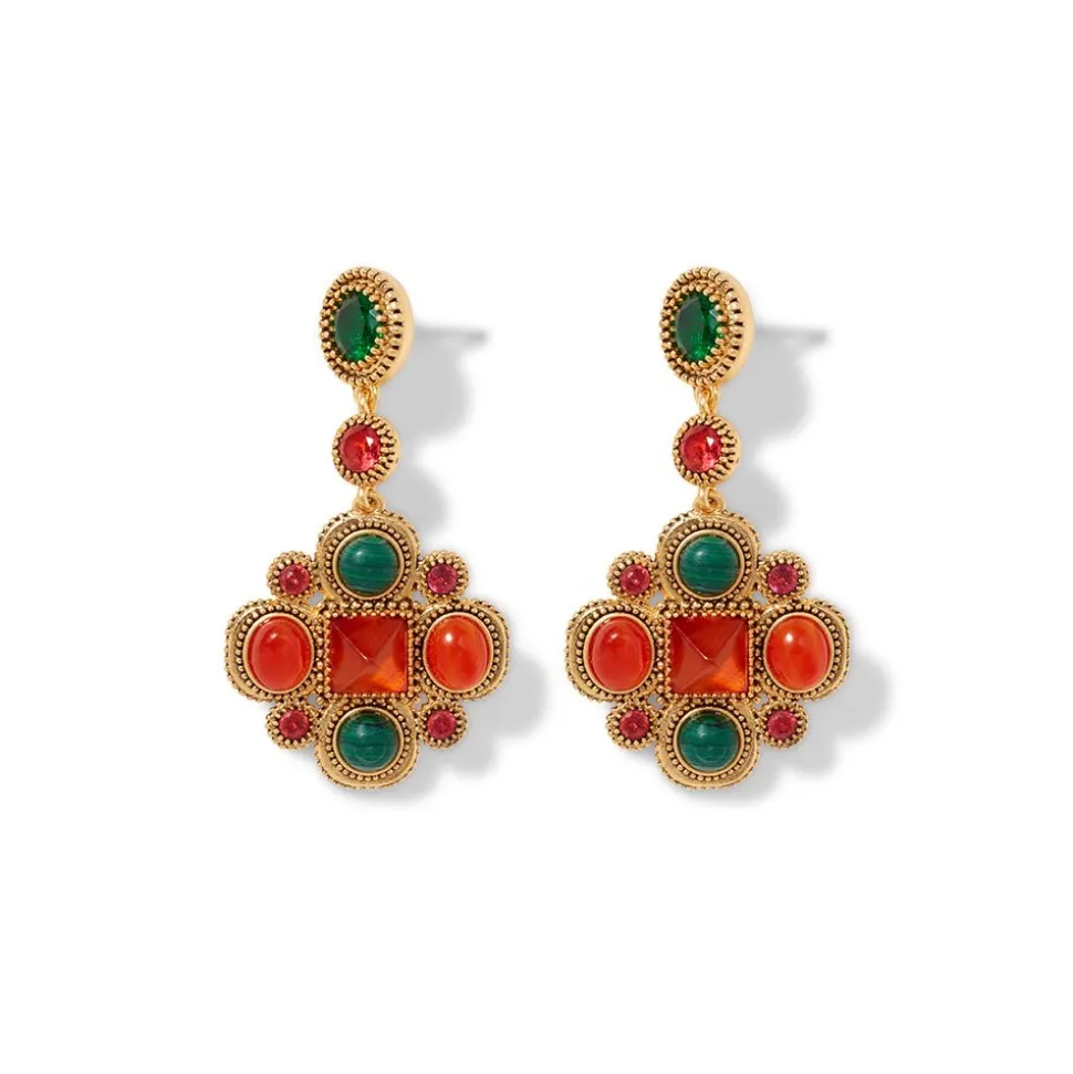 These Statement-Making Jewel-Toned Earrings Celebrate A Head-Turning Necklet (Date Unknown) Attributed To Algeria And Now In The Met’S Holdings Of Islamic Art. The Original Adornment, With Its Vibrant Red, Orange, And Green Stones, Is Likewise Embellished With Crescent-Shaped Pendants That Hang From The Base. These Suspended Elements Would Have Made A Sound With The Wearer’S Movement, Lending An Auditory Dimension To This Striking Piece.