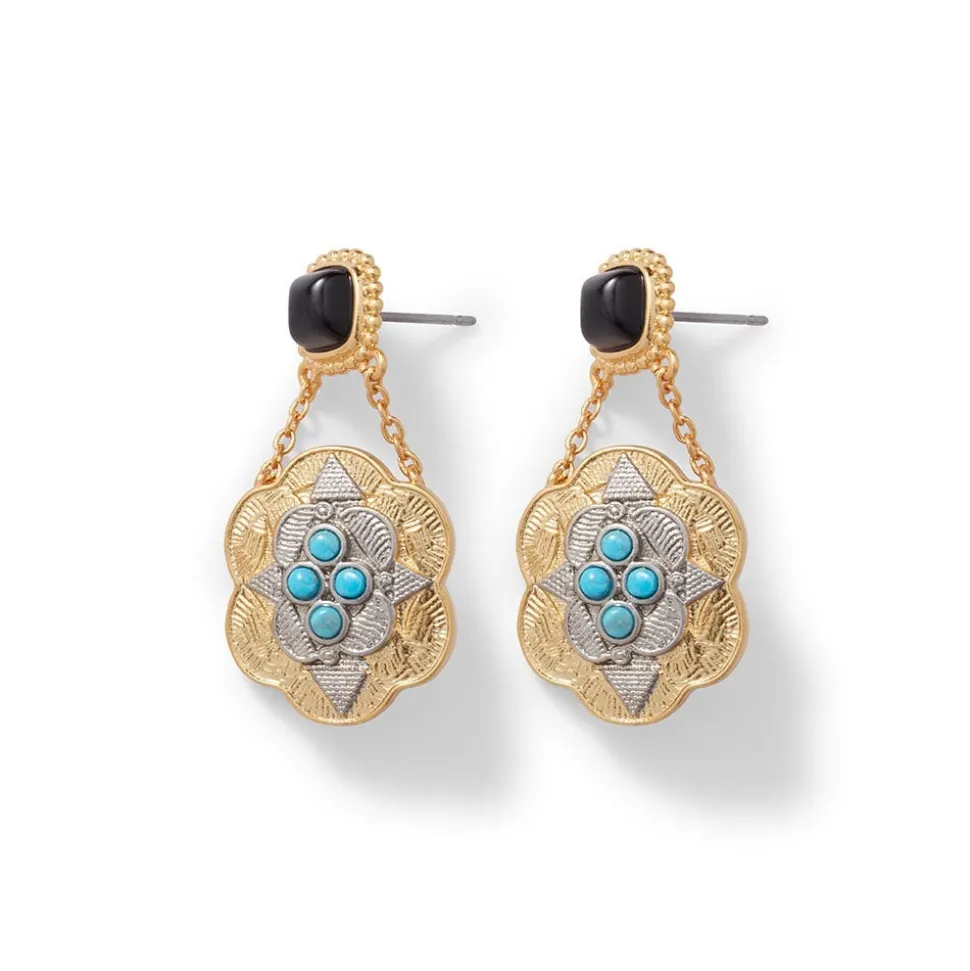 Embellished With Turquoise And Black Glass, These Striking Drop Earrings Reinterpret A Lavish Horse Whip (Late 19Th–Early 20Th Century) In The Met’S Islamic Art Collection. Attributed To Iran Or Central Asia, The Original Whip Is One Of A Pair, Both Of Which Are Richly Decorated With Pseudo-Granulation And Turquoise In The Kazakh Style And Feature Likenesses Of Horse Heads—A Rare Attribute. Such Opulent Trappings Are Reminiscent Of The Regalia Produced During The Safavid And Ottoman Dynasties, Which Clearly Served As Models For These Pieces In The Museum’S Holdings. Islamic Trappings Are Particularly Fine, And Both Turkmen Tribes And City Dwellers Carried On The Tradition.